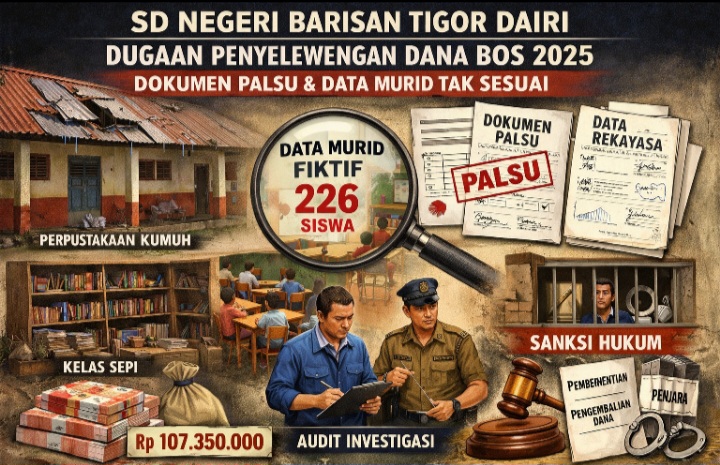 MEDAN – DAIRI, 9 MARET 2026 – Kasus terkait Dana Bantuan Operasional Sekolah (BOS) Tahun Anggaran 2025 sebesar Rp 107.350.000 di SD Negeri Barisan Tigor, Kecamatan Tigalingga, Kabupaten Dairi, Provinsi Sumatera Utara semakin mengkhawatirkan setelah ditemukan indikasi adanya dokumen palsu serta ketidaksesuaian jumlah murid yang dilaporkan dengan data sebenarnya. Hingga saat ini, pihak sekolah masih belum memberikan klarifikasi resmi terkait dugaan tersebut.