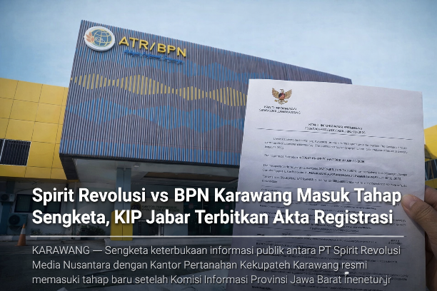 KARAWANG — Sengketa keterbukaan informasi publik antara PT Spirit Revolusi Media Nusantara dengan Kantor Pertanahan Kabupaten Karawang resmi memasuki tahap baru setelah Komisi Informasi Provinsi Jawa Barat menerbitkan Akta Registrasi Sengketa Informasi.