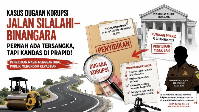Sudah hampir tiga tahun, penanganan dugaan tindak pidana korupsi proyek peningkatan Jalan HRS Silalahi–Binangara Tahun Anggaran 2021 di Dinas Pekerjaan Umum dan Tata Ruang Kabupaten Dairi berjalan pelan. Terlalu pelan untuk ukuran perkara yang menyangkut uang negara dan kepentingan publik.