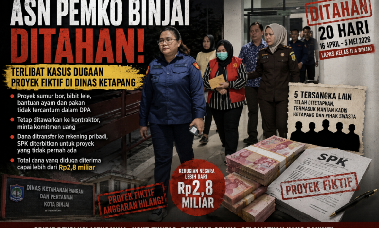 BINJAI, — Aroma busuk dugaan praktik korupsi kembali menyeruak dari tubuh birokrasi. Seorang Aparatur Sipil Negara (ASN) Pemerintah Kota Binjai berinisial RD resmi ditahan oleh Kejaksaan Negeri Binjai terkait dugaan proyek fiktif di Dinas Ketahanan Pangan dan Pertanian (Ketapang) Kota Binjai.